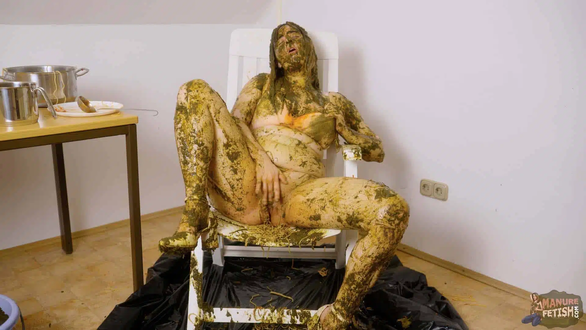 in Dung RewardsLyndra was ready to go out but wanted to eat something first. So she cooked herself some spaghetti with tomato sauce. As she was pouring the sauce on her nudles some of the tomato sauce splashed on her expensive dress. The dress is now ruined so she decides to have some fun anyway. Lyndra begins to totally wreck the dress by pouring more of the sauce and spaghetti on it. She throws everything on the floor and begins to stuff it in her panty and begins to masturbate. She stuffs some spaghetti in her ass pulls it out and eats it. Then she’s ready to bring the mess to the next level. She brings in 4 bags of cow dung and 2 buckets full with it. She starts by pouring it over her breasts and cover the dress and her boobs completely, the next bag is emptied on her head. She dunks her head in the manure bucket and covers herself more and more. Then Lyndra begins to undress and peeing on her dress, after that she beings to masturbate again in various positons till she reaches a nice orgasm.